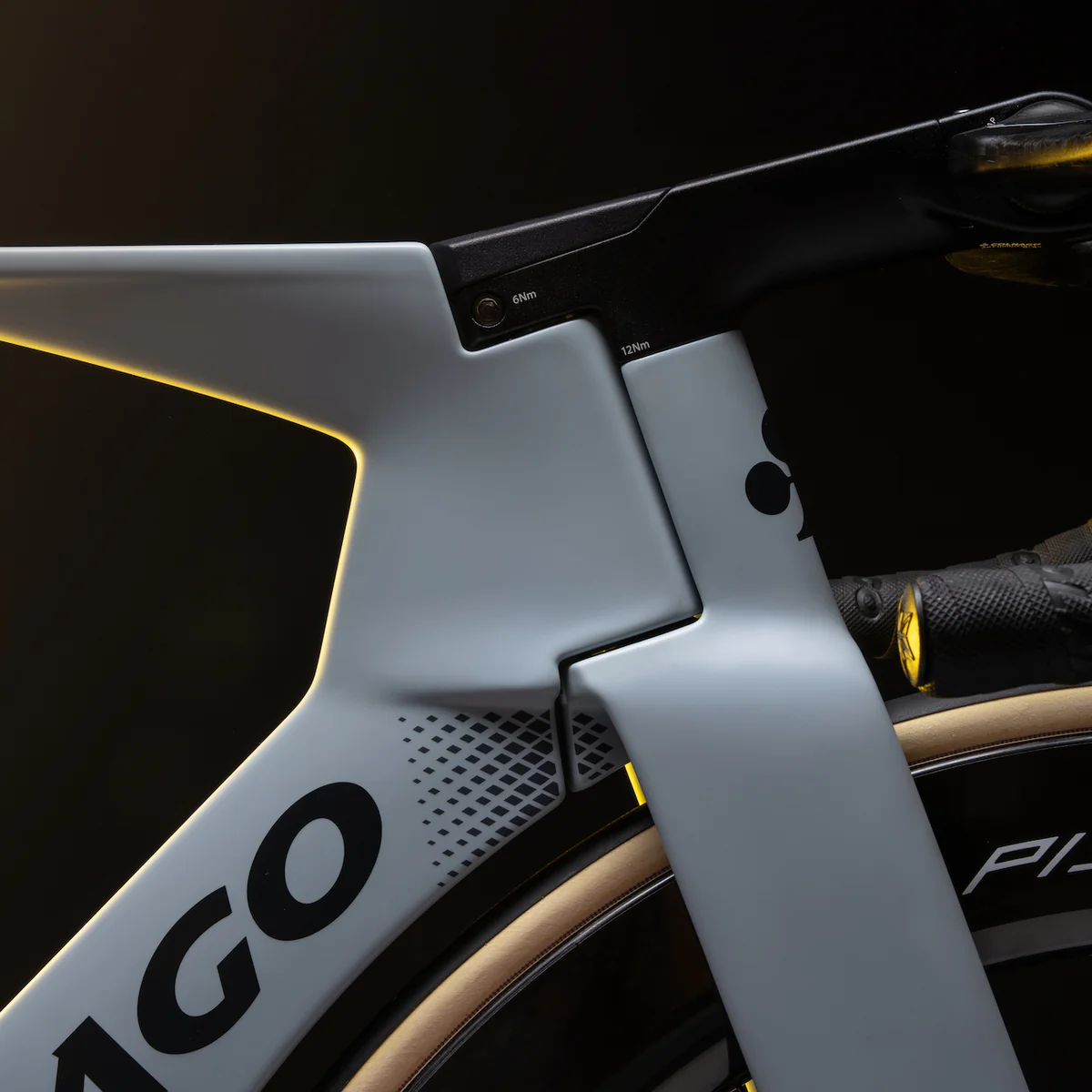 Aerodynamik, Steifigkeit und Integration greifen nahtlos ineinander. Die markante Dual-Crown-Gabel sorgt für maximale Frontstabilität und präzises Handling, während der Monocoque-Carbonrahmen jede eingesetzte Kraft direkt in Vortrieb übersetzt. Ein überdimensioniertes Tretlager und gezielt verstärkte Strukturen halten das Bike selbst unter maximaler Belastung stabil und effizient.